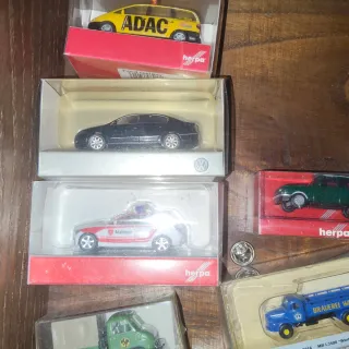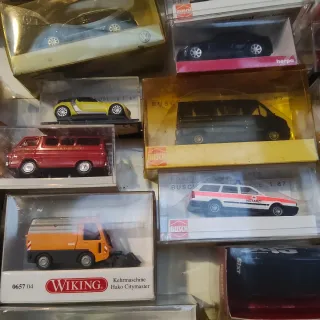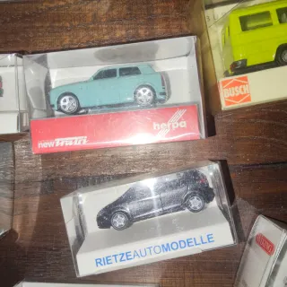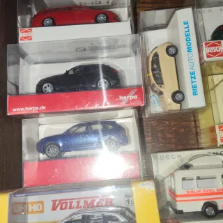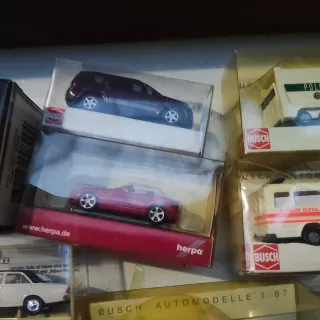 Lote de coches a escala 1:87 de coleccionista. Incluye modelos de marcas reconocidas. - Coches de diferentes marcas como Busch, Herpa y Rietze. - Modelos variados en diferentes colores, incluyendo rojo, negro y azul. - Todos en sus cajas originales
