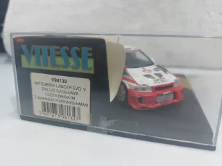 Réplica detallada a escala 1:43 del Mitsubishi Lancer Evo V Gr.A de Tommi Mäkinen y Risto Mannisenmäki, 3°s clasificados del Rallye Catalunya - Costa Brava 1998. - Marca VITESSE. - Referencia V98132 (mini diploma que lo acredita incluido) - Dorsal número 1 - Decoración Mitsubishi, RalliArt, OMP, PIAA, Michelin... - Incluye peana y urna de exposición (en bastante buen estado para el paso de tantos años). Se hacen lotes, más modelos en mi perfil. Palabras clave: coche rally rallye maqueta modelismo escala 1/43 wrc erc irc ixo spark norev altaya hpi vitesse skid autoart minichamps sport racing transkit