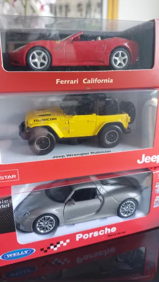 Conjunto de tres coches a escala 1/43 - Ferrari California rojo - Jeep Wrangler Rubicon amarillo. - Porsche plateado.