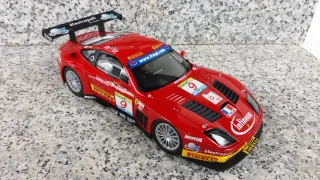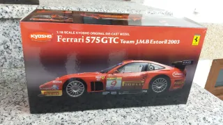 Réplica a escala 1:18 del Ferrari 575 GTC del equipo J.M.B Estoril 2003. Esta en buen estado, uno de los soportes del alerón trasero no es original, está hecho a mano y no se nota la diferencia.