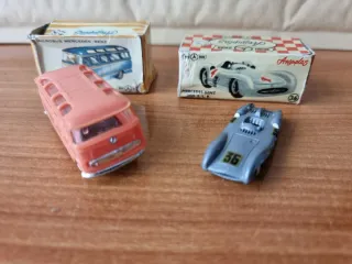 Conjunto de vehículos de juguete de la marca Anguplas, con temática Mercedes. Se compone de: -Coche a escala 1/86 Mercedes 300 SLR de Anguplas. Made in Spain. Ver imágenes para ver su estado. Conserva la caja, pero le falta una solapa, ver imágenes. -Microbus Mercedes a escala 1/86 en color rojo anaranjado de Anguplas. Made in Spain. Caja original muy tocada pero vehiculo en buen estado, ver imágenes para una mejor descripción.