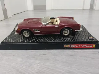 Réplica del Ferrari 250 GT Spider de Hot Wheels, presentado en una base con acabado de adoquines. - Modelo a escala detallado. - Color burdeos. - Incluye placa con el nombre del modelo y logo de Hot Wheels.
