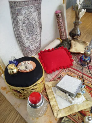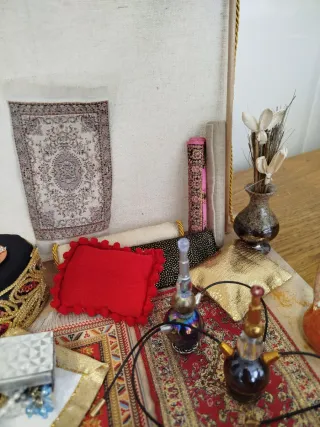 Detalle de escena oriental para belén o diorama. Puesto del zoco. Hecho a mano. Para figuras de 20 a 22 cm. Mide 29x29x26 de alto. Se entrega con todo lo que se ve en las fotos. Modelo único porque se realiza con los materiales con los que cuento en ése momento.Más en mi perfil.