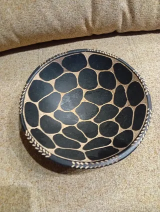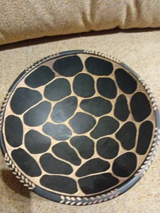 Precioso recipiente decorativo traído de Malaui, África. Su diseño evoca la estética africana. - Diseño con patrón de manchas. - Borde decorado con motivos trenzados.
