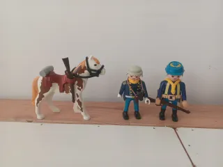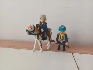 Set de figuras de Playmobil con temática militar. - Un soldado a caballo con uniforme azul y sombrero gris. - Un soldado a pie con uniforme azul, casco azul y rifle. - El caballo es blanco con manchas marrones. 2 capas 2 bayoneta y muñeco Se escuchan ofertas se hacen lotes