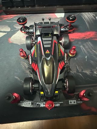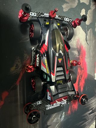 Mini 4WD Tamiya VZ Chassis con detalles en rojo y negro. - Diseño aerodinámico. - Ruedas con aros rojos. - Detalles en fibra de carbono.