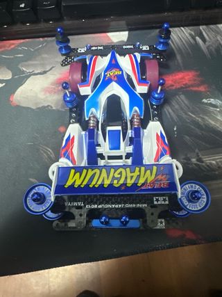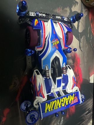 Mini 4WD Tamiya Beat Magnum con diseño deportivo y detalles en azul, blanco y rojo. - Carrocería con gráficos llamativos. - Ruedas de color morado. - Componentes de color azul metálico.