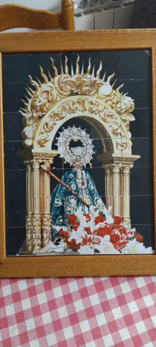 Imagen religiosa de Nuestra Señora de la Bien Aparecida. cuadro coleccionable del mosaico de la Virgen de la Bien Aparecida, patrona de Cantabria. Descripción: Es un mosaico compuesto por pequeñas piezas que representan el retablo de la Virgen bajo un arco dorado. Dimensiones: El marco mide aproximadamente \(41\times 32\) cm. Origen: Se trata de un artículo de colección - Representación con manto y corona. - Rodeada de rosas rojas y blancas. - Marco de madera.