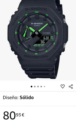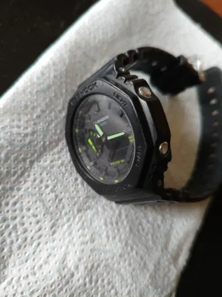 Reloj G-Shock con diseño analógico y digital. El color principal es negro con detalles en verde. Fue un regalo a un chaval y solo lo uso un fin de semana. Como nuevo, precio en tienda 85€. - Diseño sólido. - Resistente al agua WR 20BAR.