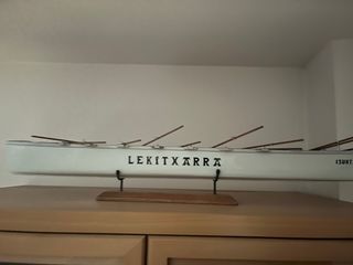 Maqueta de trainera con el nombre 'LEKITXARRA' y 'ISUNTZ.' en el casco. Incluye remos. - Base de madera para exposición. - Soporte metálico.