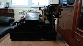 Máquina de escribir antigua, un objeto clásico con un diseño robusto. - Teclado con teclas redondas. - Carcasa metálica negra.