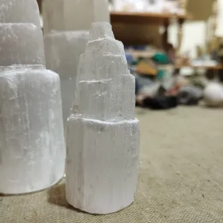 Monolito de selenita de tamaño mediano, con una forma escalonada. - Material: Selenita. - Color: Blanco translúcido. - Forma: Escalones. - Acabado: Natural. Mide 10 cm de alto x 3 cm de ancho