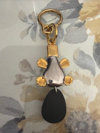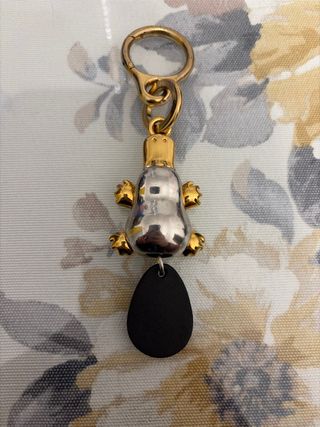Llavero de la marca Loewe con un diseño único. - Figura de animal plateada con detalles dorados. - Colgante de piel en forma de huevo.