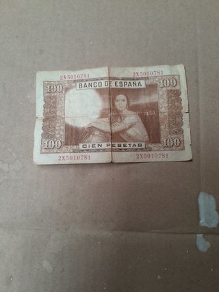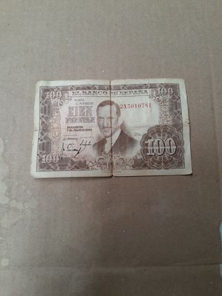 billetes de cien pesetas, emitidos el 7 de abril de 1953. Se encuentran en buen estado de conservación, considerando su antigüedad. - Billetes de colección. - Serie 2X5010781.