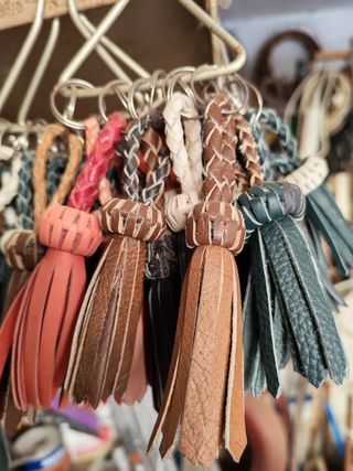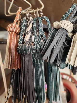 Conjunto de llaveros hechos a mano con cuero. - Diseño trenzado en la parte superior. - Flecos de cuero en la parte inferior. - Varios colores disponibles. - Varios tamaños disponibles. El precio es por los más grandes.los medianos valen un € menos y los pequeños uno menos. Te envío fotos de todos para que elijas