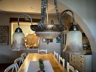 Elegante lámpara colgante de estilo antiguo, con un diseño clásico y detalles ornamentales. - Estructura metálica con acabado envejecido. - Tulipas de cristal esmerilado con motivos florales. - Cadena para colgar. - Diseño de dos luces.