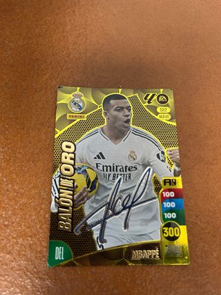 Cromo de colección de Mbappé, edición Balón de Oro. - Diseño dorado con detalles en negro. - Incluye autógrafo. - Número de carta: 522. - EA Sports.