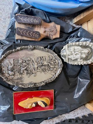 Conjunto de artículos antiguos de cuero, incluyendo petacas, dediles y un monedero.Hechos en Urda, Toledo, famoso por sus petacas. Éstas tienen más de 100 años de ahí su estado. Tienen grabados, en una se aprecia más que en otra. Los dediles son hechos por los propios usuarios, también muy antiguos. El monedero es más moderno pero con más de 60 años, también usado bastante. El PRECIO SEGUN LOS ARTICULOS QUE QUIERAS - Material: Cuero. - Diseño grabado en el monedero. - Cierre de cordón en una de las petacas.