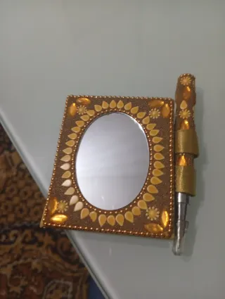 Conjunto decorativo de agenda pequeña con espejo y un bolígrafo a juego. Ambos elementos están adornados con detalles brillantes. - Agenda con marco decorado. - Espejo ovalado integrado. - Bolígrafo con diseño a juego. - Dos anillas decorativas doradas.