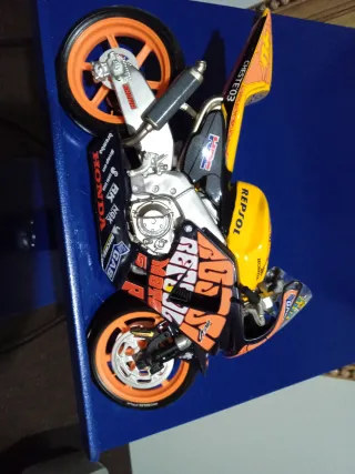 Réplica detallada de la moto Honda Repsol, utilizada por Valentino Rossi. - Diseño de la escudería Repsol. - Colores naranja, amarillo y negro. - Detalles de patrocinadores como GAS, MICHELIN, NGK, RK, HONDA, BREMBO, CHESTE'03.