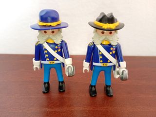 Dos figuras de generales nordistas de Playmobil. - Uniforme azul con detalles dorados y rojos. - Sombrero negro y azul con distintivos. - Incluye accesorios como cinturón y cartuchera.