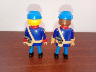 Dos figuras de soldados nordistas de Playmobil, con uniforme azul y sombrero. - Uniforme azul con detalles rojos y dorados. - Sombrero azul con adorno dorado. - Bandolera beige.