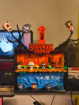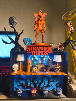 Diorama personalizado de Stranger Things, ideal para coleccionistas. - Incluye figuras de demogordon - Decoración temática con luces. - Base con diseño del Upside Down. No incluye figuras funko, luz superior a pilas, luz interior vía USB