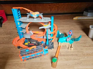 Conjunto de juguetes Hot Wheels que incluye una pista con temática de tiburón y un camión. - Pista de carreras con lanzador y elementos interactivos. - Camión transportador de coches Hot Wheels.