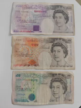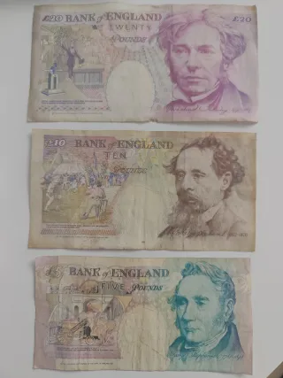 Conjunto de tres billetes de Libras Esterlinas del Banco de Inglaterra. - Billetes de 5, 10 y 20 Libras. - Emitidos entre 1990 y 1993.