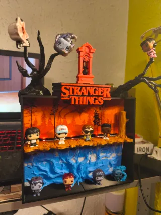Expositor temático de Stranger Things, ideal para colecciones de Funko Pop y figuras de Kinder Joy. Presenta un diseño detallado con elementos icónicos de la serie. - Figuras de personajes de Stranger Things.no incluidas son solamente de referencia. - Decoración inspirada en el Upside Down. - Luces LED integradas para ambientación.luz superior se conecta por mecanismo a pilas 3032, y la tira led inferior se conecta por USB . Incluyer la figura de demogorgon de 16 cm pintada a mano y aerógrafo.