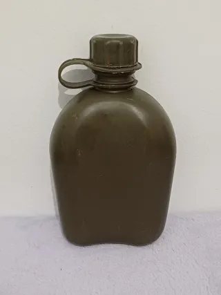 Cantimplora de estilo militar en color verde. Señales de tiempo y uso en maniobras militares - Diseño clásico y funcional. - Tapa con asa para facilitar el transporte.