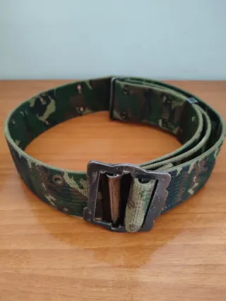 Cinturón Ceñidor Boscoso del Ejército Ha sido utilizado en maniobras Colección coleccionista Ejército Español militar Cinturón ceñidor del Ejercito Español con camuflaje boscoso. Cinturón de 6 cm de ancho, de tela gruesa muy resistente. Con doble hilera de agujeros en su longitud para incorporarle unas trinchas. Hebilla de acero.