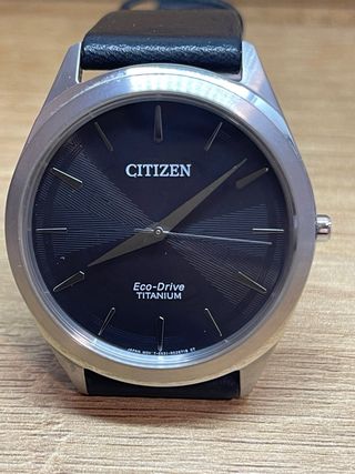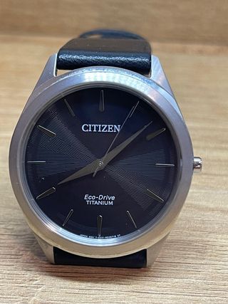 Elegante reloj Citizen con tecnología Eco-Drive y caja de titanio. Cristal de cuarzo. Movimiento de cuarzo japones de 38 mm. Un accesorio moderno y duradero. - Esfera de color negro con diseño lineal. - Correa de cuero negra. - Movimiento Eco-Drive. La correa de fábrica es algo endeble por lo que se incluye correa adicional de piel sin estrenar