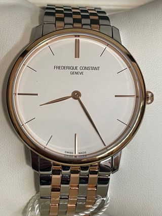 Elegante reloj Frederique Constant Classic Slimline. - Esfera blanca con detalles en oro rosa. - Correa de acero inoxidable y oro rosa. - Diseño delgado y sofisticado. El reloj está sin estrenar, aún conserva los plásticos protectores en la caja y su etiqueta. Se entrega completo con caja original y con certificado de autenticidad