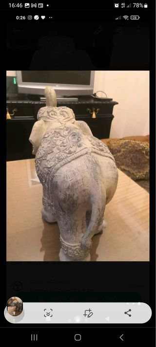 Figura decorativa de un elefante con un diseño detallado y ornamentado. - Color gris piedra. - Acabado con relieves. - Base estable.