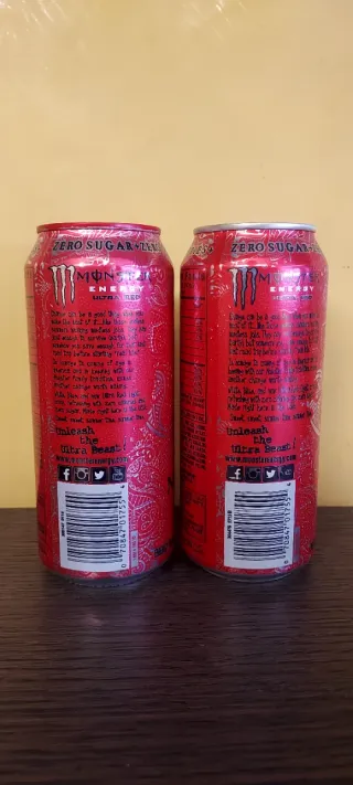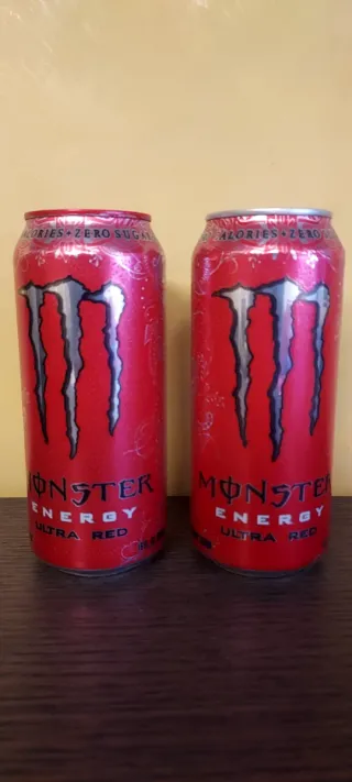 Dos latas de Monster Energy Ultra Red, ideales para coleccionistas. - Edición especial de Estados Unidos. - Diseño llamativo en color rojo.