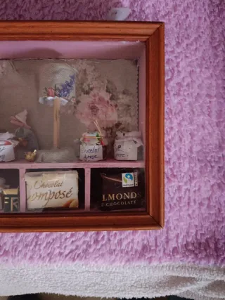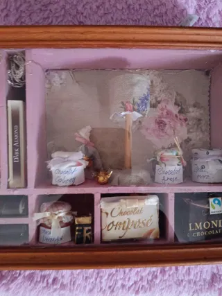 Pequeña caja decorativa con temática de chocolates y dulces. - Contiene miniaturas de frascos con etiquetas Chocolat, Chobory, Choceler, furese, More, Verey. - Incluye una caja de Chocolat composé y una tableta de LMOND CHOCOLATE. - Elementos decorativos adicionales como un pequeño lazo dorado y una caja con las letras FR. - Marco de madera. - Fondo con diseño floral.