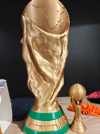 Vendo réplica de la copa del mundo a tamaño real (36,8 cm de altura), con las mismas dimensiones que el trofeo original. Están fabricadas mediante impresión 3D y acabadas con pintura dorada metálica, lo que les da una apariencia muy llamativa y realista. Ideales para: Decoración temática de fútbol Coleccionistas Eventos o celebraciones deportivas Regalo para aficionados al fútbol Características: Altura: 36,8 cm Peso aproximado: 300 g cada una Diseño detallado Inscripción “FIFA WORLD CUP” en la base ⚠️ La copa pequeña que aparece en la foto no está incluida, solo se muestra para comparar tamaños.