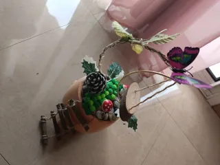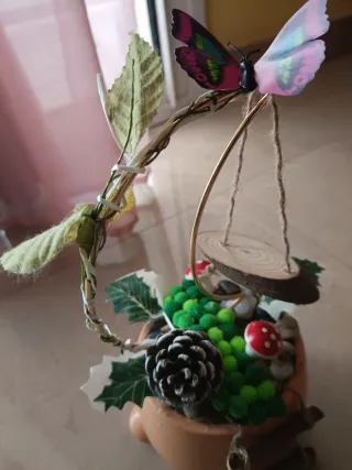 Encantador jardín de hadas decorativo, perfecto para añadir un toque mágico a cualquier espacio. - Incluye una maceta de terracota. - Adornado con piñas, bayas verdes y setas. - Cuenta con una pequeña valla de madera y un columpio con un disco de madera. - Mariposa decorativa con alas vibrantes.