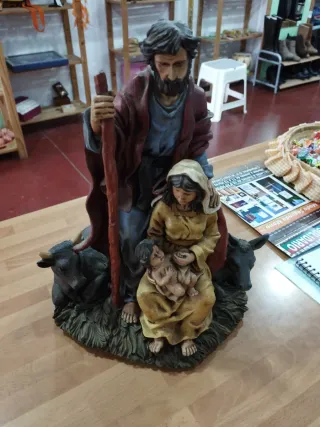 Figura de nacimiento tradicional, ideal para decoración. - Elaborado en barro pintado a mano. - Base de madera. - Representación de la Sagrada Familia con animales. Lo recaudado se destina a subvencionar BECAS Escolares en África. Ref. Almacén 5