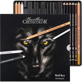 CRETACOLOR Wolf Box, Juego de Dibujo Blanco-Negro, 25 Piezas, Utensilios de Dibujo, Incl. Goma de borrar amasada y sacapuntas de Artista, y Cuero para pulir