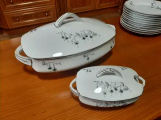 Elegante vajilla de porcelana de la marca checa Pirken Hammer conocida por su porcelana traslúcida y su distintiva marca de martillos cruzados. Esta fábrica estaba cerca de Karlovy Vary (anteriormente Karlsbad) en Bohemia. La porcelana de esta región fue muy apreciada durante el Imperio Austrohúngaro y posteriormente en Checoslovaquia. El término "DÖRER" visible es el nombre del diseño específico de la porcelana. Datada aproximadamente en 1920. La vajilla está numerada como se ve. Las piezas son las que se ven en las fotos. 12 servicios. Solo falta un plato de postre.