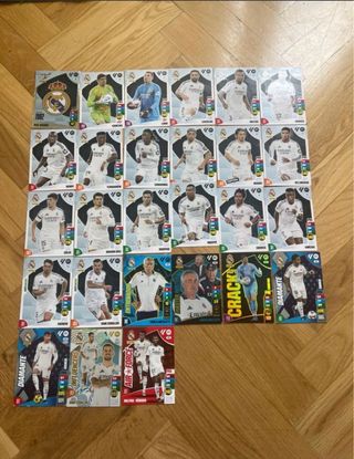 Colección de cromos de la Liga Adrenalyn XL del Real Madrid para la temporada 2024-2025. Incluye cartas de jugadores y entrenadores. - Cromos de la colección Adrenalyn XL. - Temática: Real Madrid. - Temporada: Liga 2024-2025.