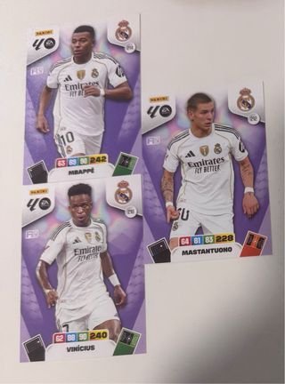 Conjunto de tres cromos del Real Madrid de la colección Adrenalyn XL 25-26. También se vende cada uno individualmente por 2 euros. Y los tres juntos por 5 euros. - Mbappé - Vinícius - Mastantuono