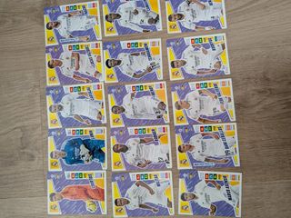 Colección de cromos de fútbol Adrenalyn XL de la temporada 2022/2023. Incluye varios jugadores. - Cromos de la colección Adrenalyn XL. - Temporada 2022/2023. - Jugadores como Courtois, Lunin, Militao, Rüdiger, Carvajal, Mendy, Lucas Vázquez, Nacho, Tchouameni, Rodrygo, Fede Valverde, Dani Ceballos y Marco Asensio.