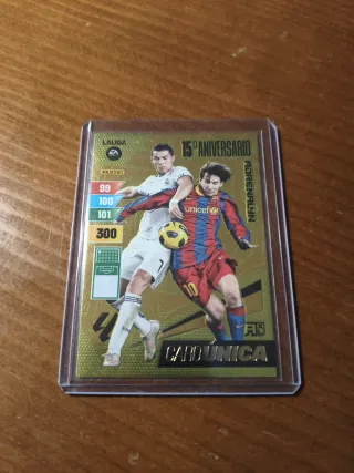 Tarjeta única de fútbol Adrenalyn XL con Cristiano Ronaldo y Lionel Messi. - Edición especial 15º Aniversario. - Incluye estadísticas de los jugadores. - Diseño dorado con detalles de alta calidad. Cromos en perfecto estado Entrega en mano en Córdoba capital y envío a través de wallapop envíos. No acepto ofertas