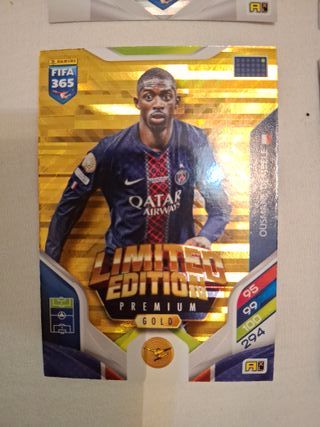 Colección de cromos Adrenalyn FIFA 365 Premium Gold. - Incluye 3 cromos. - 1 cromo de 350 Coins Limited Edition. - 2 cromos de jugadores Premium Gold: Ousmane Dembélé y Dominik Szoboszlai.
