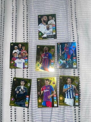 Colección de cromos Adrenalyn Balón de Oro de la temporada 21-22. Incluye varios jugadores destacados. - Cromo de Karim Benzema (Excellence). - Cromo de Memphis Depay (Balón de Oro). - Cromo de Pierre-Emerick Aubameyang (Momentum). - Cromo de Thibaut Courtois (Balón de Oro). - Cromo de Pedri (Balón de Oro). - Cromo de Mikel Oyarzabal (Balón de Oro).