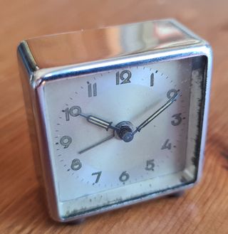 Despertador de viaje antiguo, cromado y con funda de cuero. No funciona, la campanilla si, se le puede dar cuerda.