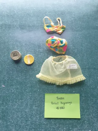 Precioso conjunto de ropa y accesorios para muñeca Barbie, colección Perfect Beginnings. REF 0060. Barbie de la era MOD. Años 70. ESTADO SEGÚN FOTOS. Si tienes cualquier duda o necesitas mas fotos, no dudes en ponerte en contacto conmigo. SE ACEPTAN OFERTAS O CAMBIO POR CROMOS O ALBUMES DE FÚTBOL ANTIGUOS como todos mis lotes. Barbie Midge? - Incluye top, braguita y falda. - Accesorios de talquera y borla. - Diseño colorido y tela de tul.